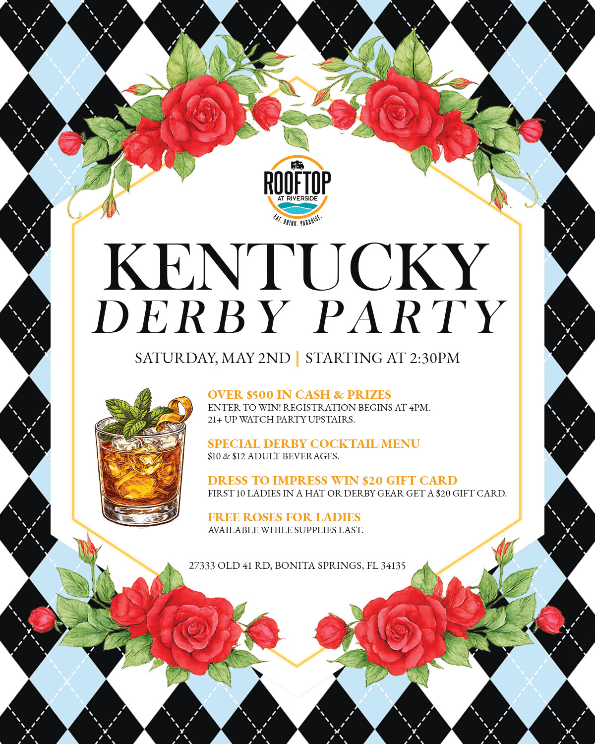 Derby Day at Rooftop Over $500 in cash & prizes up for grabs in our Best Derby Hat Contest. Special Derby cocktail menu Free roses for the ladies (while supplies last) Dress to impress - first 10 get a $20 gift card Starts at 2:30PM | Registration at 4PM
